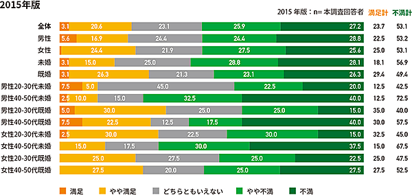 最後に「自身の収入に対する満足度」を選択式で聞くと、不満が減少傾向だったが、満足している人は増えておらず、中間層が目立つ脚気となった。ここで「男性20~30代未婚」を見ると、収入への満足度が高まっていることも明らかとなった。一方同年代である「女性20~30代未婚」は満足度が低くなっており、差異が目立つ結果となった。
