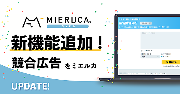 Webマーケティング支援のFaber Company(ファベルカンパニー)は、人工知能(AI)を活用したSEO(検索エンジン最適化)プラットフォーム「MIERUCA(ミエルカ)」に「広告競合分析」機能を追加した、と12月21日に発表した。リスティング広告の出稿状況を分析する新機能で、特定キーワードでの検索時に表示されるリスティング広告の掲載順位や、検索上位広告のタイトル・説明文の重要トピックを自動解析できる。