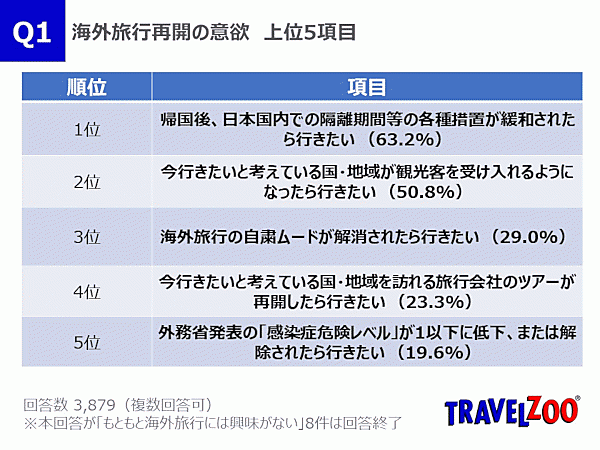 そうしたなか、一般旅行者に「海外旅行を再開したいか」という意欲について聞くと、「帰国後、日本国内での隔離期間等の各種措置が緩和されたら行きたい」63.2%が最多で、「今行きたいと考えている国・地域が観光客を受け入れるようになったら行きたい」50.8%、「海外旅行の自粛ムードが解消されたら行きたい」29.0%がそれに続いた。渡航先の状況以上に、“帰国後の措置”が旅行再開の障壁となっていることがわかる。