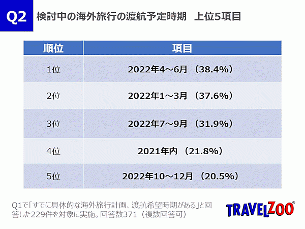 「すでに具体的な海外旅行計画、渡航希望時期がある」と回答した229人に予定時期を聞くと、「2022年4~6月」38.4%。「2022年1~3月」37.6%、「2022年7~9月」31.9%と、直近の長期休暇で渡航予定の人が多い。