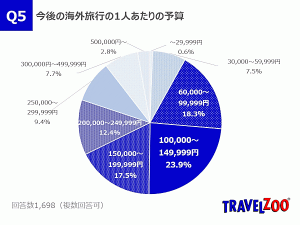 さらに、海外旅行意欲のあるメンバー1,698人に、「今後の海外旅行の1人あたりの予算」を聞くと、最多は「100,000~149,999円」23.9%で、全体的に10万円以上の回答が7割を超えていた。