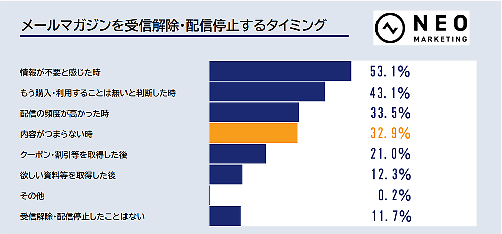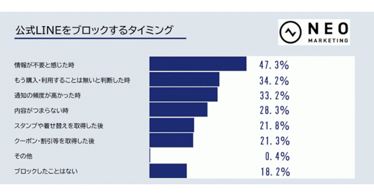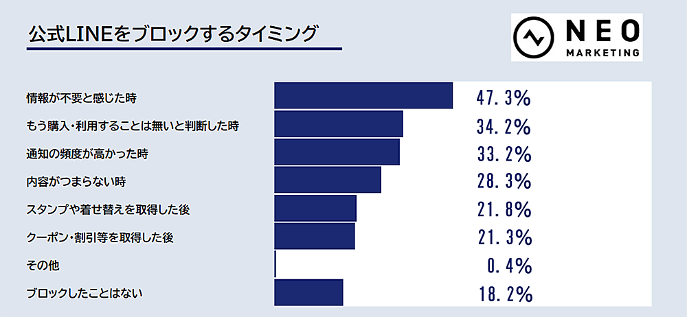 「企業・ショップの公式LINEをブロックするタイミング」「企業・ショップのメールマガジンを受信解除・配信停止するタイミング」を聞くと、どちらも「情報が不要と感じた時」が最多で、ほぼ半数を占めている。実際には、企業が配信している情報とユーザが欲しいと思っている情報に、かなりのギャップがあると考えられる。