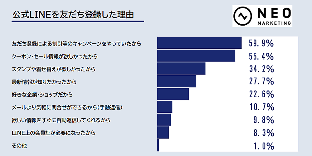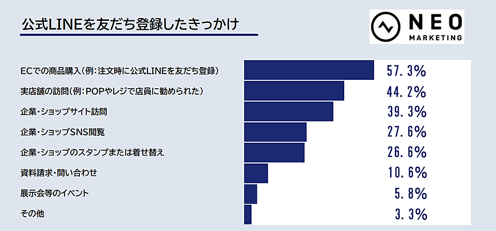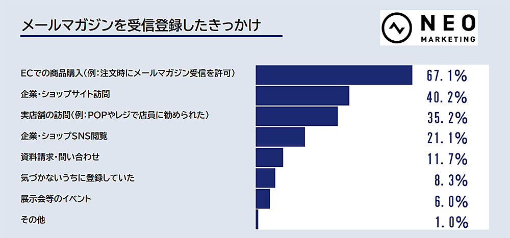 まず、「企業・ショップの公式LINEやメールマガジンを登録したきっかけ」を聞くと、LINE(57.3%)でもメルマガ(67.1%)でも「ECでの商品購入」がもっとも多かった。