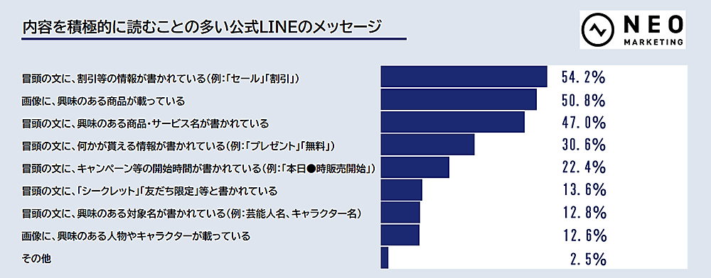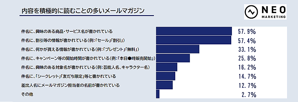 「内容を積極的に読むことの多い公式LINE・メールマガジンとしてあてはまるもの」を聞くと、「割引等の情報が書かれている(例:「セール」「割引」)」が、公式LINE(54.2%)もメールマガジン(57.9%)も半数を超えていた。