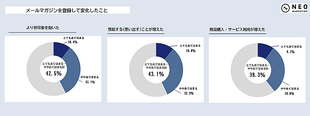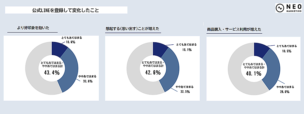 また「公式LINEを登録・メールマガジンを受信登録して変化したこと」を聞くと、「より好印象を抱いた」「想起する(思い出す)ことが増えた」「商品購入・サービス利用が増えた」といったポジティブな変化が、4割ほどあることが判明した。