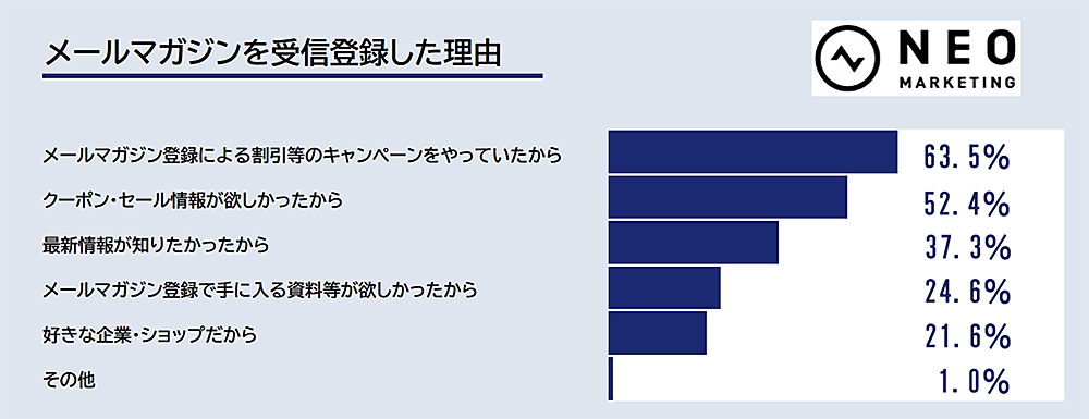 「公式LINEを友だち登録した理由」「メールマガジンを受信登録した理由」については、ともに「割引等のキャンペーンをやっていたから」が最多。「クーポン・セール情報が欲しかったから」がそれに続き、いずれも半数を超えていた。公式LINEでは、スタンプや着せ替えを目当てに登録する割合、メールマガジンでは、最新情報を目当てに登録する割合が高い。