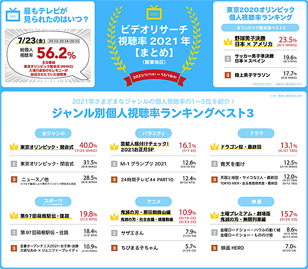 ビデオリサーチは、2021年(2021年1月1日~12月19日)に放送された番組を対象にテレビ視聴率調査を実施。今年よく見られたテレビ番組をジャンル別ランキング形式で発表した。