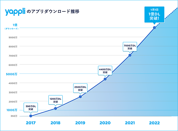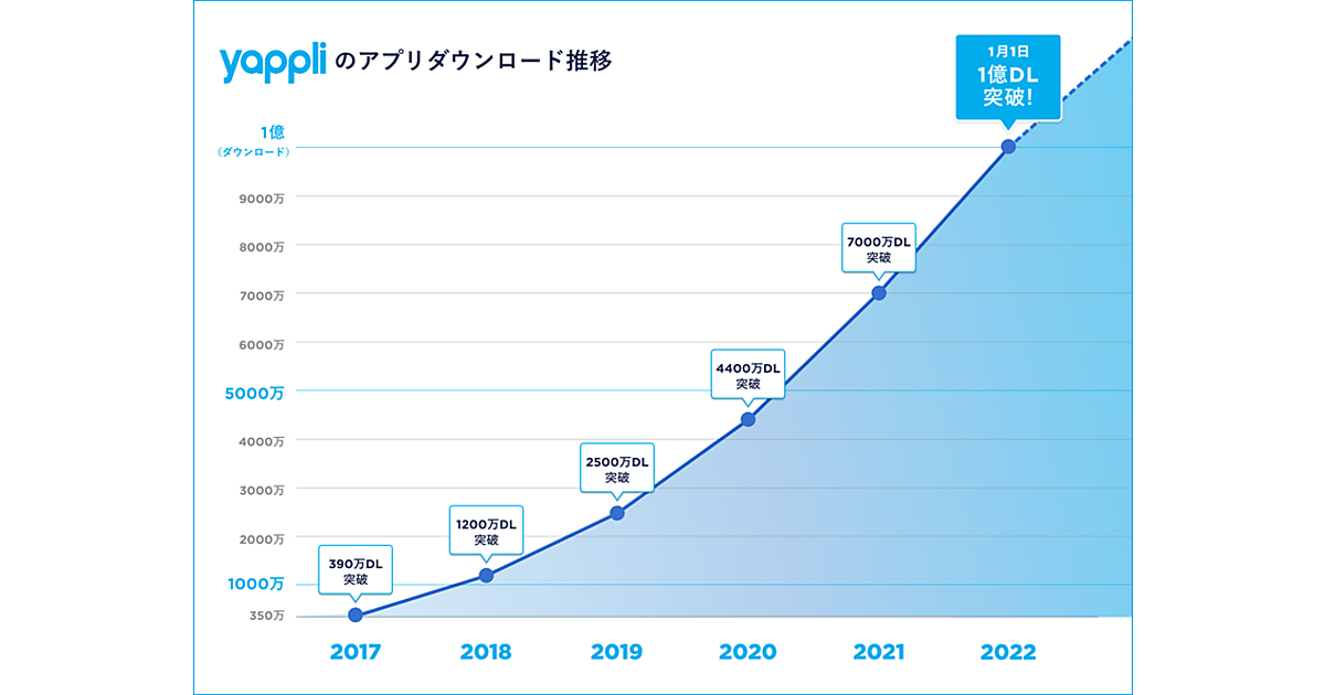 アプリプラットフォーム「Yappli(ヤプリ)」を展開するヤプリは、Yappliを使って開発したアプリの累計ダウンロード数が1月1日に1億を超えた、と1月5日発表した。緊急事態宣言の解除で外出を再開した時期にダウンロード数が増加する傾向があり、対面接触を減らして飲食のテークアウトやデリバリーができるアプリの人気が高かったことで伸びた。