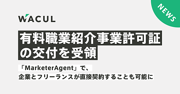 AI(人工知能)を活用したマーケティングツール開発やマーケティング人材紹介サービスを手掛けるWACUL(ワカル)は、「有料職業紹介事業」の許可証が厚生労働大臣から交付された、と1月6日発表した。これによって同社の人材マッチング事業「Marketer Agent(マーケターエージェント)」で企業とフリーランスの直接契約が可能になった。
