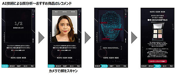 従来の自販機は一度の注文で一商品の販売だが、AIレコメンドベンダーは一度の注文で複数個の商品を同時に組み合わせて販売することができる。KATE iCON BOX専用にデザインされたパッケージの中のアイシャドウ保護シートに名入れ機能があり、世界で1つだけのオリジナルパレットを提供する。顔の印象分析をもとに提案されたオリジナルパレットの画像をスマートフォンに保存して、SNSでシェアすることも可能。