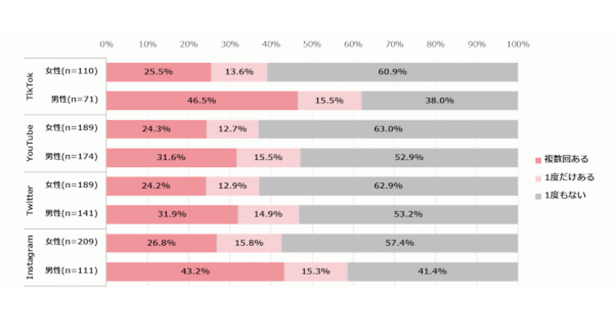 まず、「SNS広告がきっかけで商品・サービスを購入した経験があるか」を聞くと、3割前後の若年層が「ある」と回答しており、特に男性のほうが多かった。SNS別では「TikTok」で「複数回購入経験がある」の回答が、男性46.5%、女性25.5%で、大きく違いを見せた。