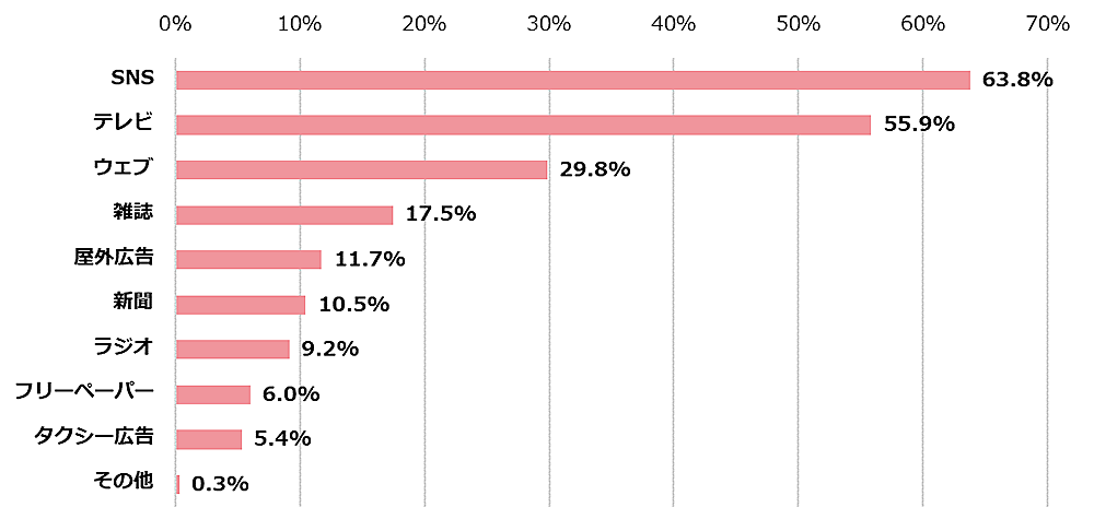 そこで広告をきっかけに商品・サービスを購入した人に、「きっかけになった広告媒体」を聞くと、「SNS」63.8%、「テレビ」55.9%、「ウェブ」29.8%が上位で、テレビよりSNS・ネットが活用されていた。
