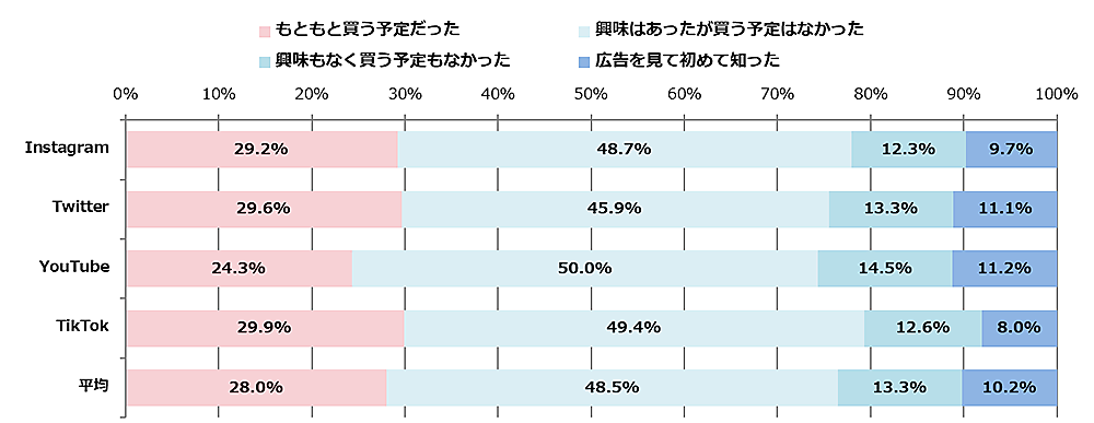 「SNS広告がきっかけで購入した商品・サービスは広告を見る前から興味があるか」と聞くと、「その商品・サービスを買う予定はなかった」+「広告を見てその商品・サービスを初めて知った」が7割を超えており、もともとは購入予定がなかったのに、広告きっかけで購入を行っていた。