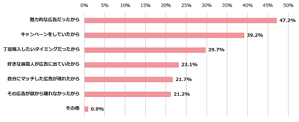さらに「SNS広告がきっかけで商品・サービスを購入した理由」を聞くと、「魅力的な広告だったから」47.2%、「キャンペーンをしていたから」39.2%、「ちょうど購入したいタイミングだったから」29.7%が上位だった。一方「好きな芸能人が広告に出ていたから」23.1%はそれほど高くない。