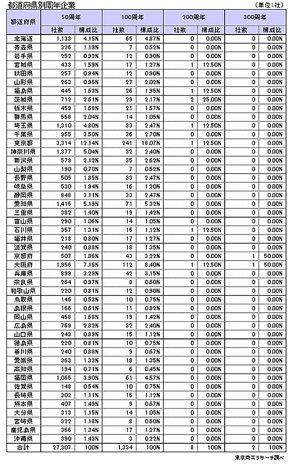 地区別では、50周年の最多は関東の9,454社、次いで近畿4,086社、中部3,681社が続いた。100周年も、関東448社(同33.5%)が最多で、それに近畿235社、中部172社が続いた。100周年は、東京都241社、大阪府112社、愛知県71社の順だった。