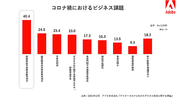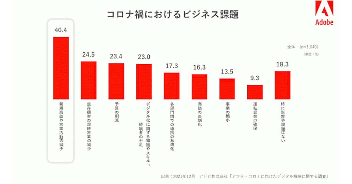 「コロナ禍で直面したビジネス課題」としては、「新規商談や営業活動の減少」40.4%が特に多く、「既存顧客の深耕営業の減少」24.5%、「予算の削減」23.4%、「デジタル化に関する知識やスキル、経験者の不足」23.0%がそれに続いて並んだ。対面営業の機会が制限され、デジタル化を進めるのもままならず、予算削減となっている負のスパイラルがうかがえる。
