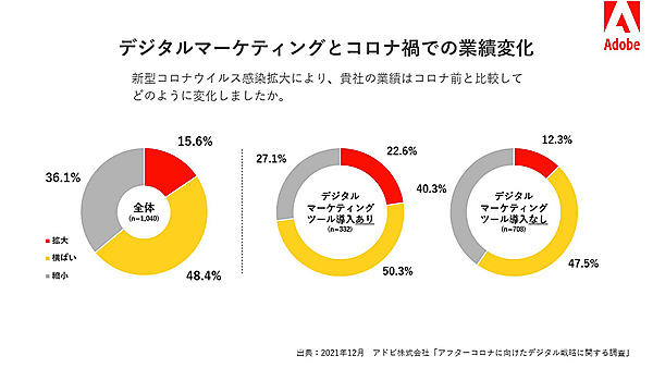 まず自社の業績の変化を新型コロナウイルス感染症拡大の前後で比較すると、「コロナ禍以前と比較して業績が縮小した」としたのは36.1%。これをデジタルマーケティングツールの導入の有無で見ると、「導入あり」企業では縮小したとの回答が27.1%に留まったのに対し、「導入なし」企業では40.3%まで増えている。