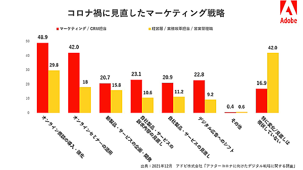 こうした状況に対し、「コロナ禍に見直したマーケティング戦略」を従業員側と経営層側に聞くと、従業員側(マーケティング/CRM担当)は「オンライン商談の導入・強化」48.9%、「オンラインセミナーの活用」42.0%などをあげているが、経営者側はほぼすべての対策で従業員側の意識を下回っていた。「特に変化/見直しはしていない」42.0%が唯一上回るなど、危機感のなさが感じられる。