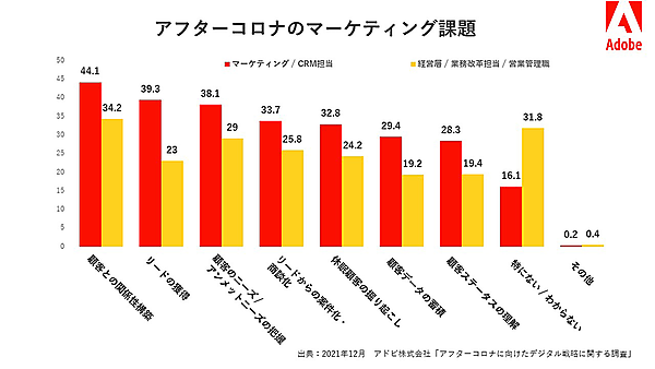「アフターコロナのマーケティング課題」についても、従業員側からは「顧客との関係性構築」44.1%、「リードの獲得」39.3%、「顧客のニーズ/アンメットニーズの把握」38.1%など、具体的な項目があがる一方、経営者側は「特にない/わからない」31.8%が上位になるなど、現状認識に差が目立つ。