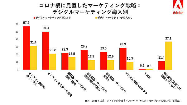 「コロナ禍に見直したマーケティング戦略」を、「デジタルマーケティングの導入あり」と「デジタルマーケティングの導入なし」で比較すると、当然ながら「導入あり」の企業ほど、「オンライン商談の導入・強化」「オンラインセミナーの活用」などが「導入なし」の企業を大きく上回っている。顧客との接点のデジタル化に注力していることがわかる。