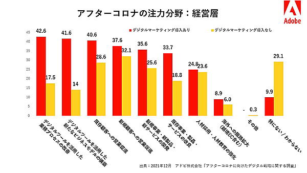 また、経営層が考える「アフターコロナのマーケティング課題」を、「デジタルマーケティングの導入あり」と「デジタルマーケティングの導入なし」で比較すると、「導入あり」では「デジタルツールを活用した業務プロセスの改善」42.6%、「デジタルツールを活用した新たなビジネスモデルの構築」41.6%などビジネスモデル変革を視野に入れているが、「導入なし」では「新規顧客への営業促進」32.1%、「既存顧客への営業促進」28.6%など、旧来型営業への注力が上位だった。