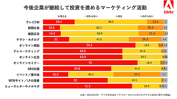 ただし最後に「今後、継続して投資するマーケティング活動」を聞くと、「オンラインセミナー」76.0%、「オンライン商談」74.3%、「ニュースレターやメルマガ」71.5%への投資を増やすという会社が多い。一方で4マス広告やイベント/展示会は2割前後に留まっている。コロナ以降デジタル化の流れはさらに加速すると推測される。
