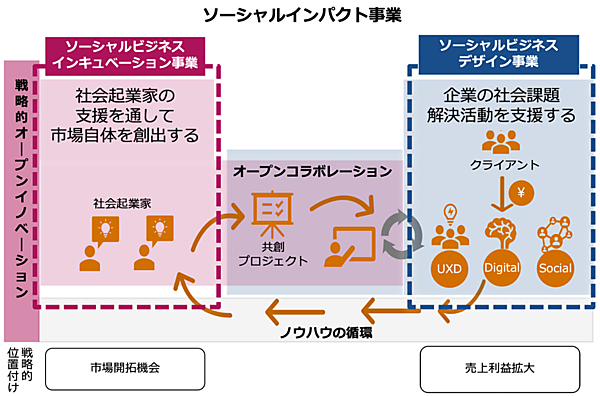 準備室で「ソーシャルビジネスデザイン事業」と「ソーシャルビジネスインキュベーション事業」の2つの事業性を検証する。デザイン事業は、社会課題の解決を目的とした企業の新規事業開発を対象に、新規事業戦略の策定▽サービスデザイン▽プロトタイピング▽システム開発▽サービスローンチ▽カスタマーサクセス――を支援する。UXDや、親会社のNTTデータの事業開発コンサルティングやアジャイル開発のノウハウを駆使する。