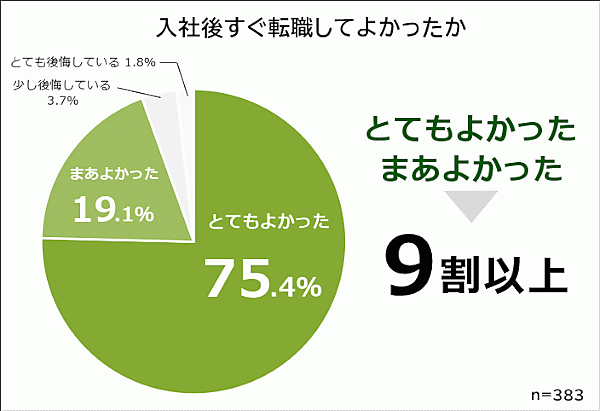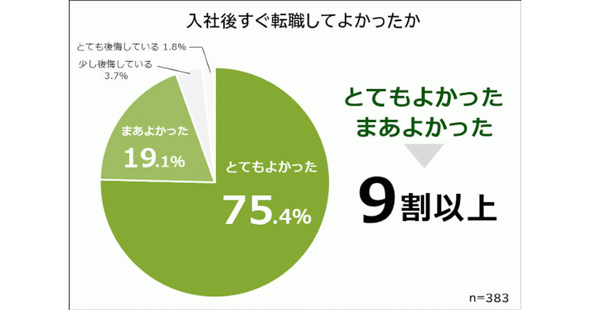 そこで「入社後すぐに転職してよかったですか」とあらためて聞くと、「よかった」75.4%、「まあよかった」19.1%と、合計94.5%が即時の判断に肯定的だった。「入社してすぐ辞めたい」と感じるのは、レアケースと思われがちだが実際には頻発しており、即退社というのが最適解かもしれないと推察される。「すぐに辞めたので、履歴書に短期離職した職歴を書かなくても不自然でない」という声も存在した。「すぐに転職先が見つかった」という体験談も複数あった。