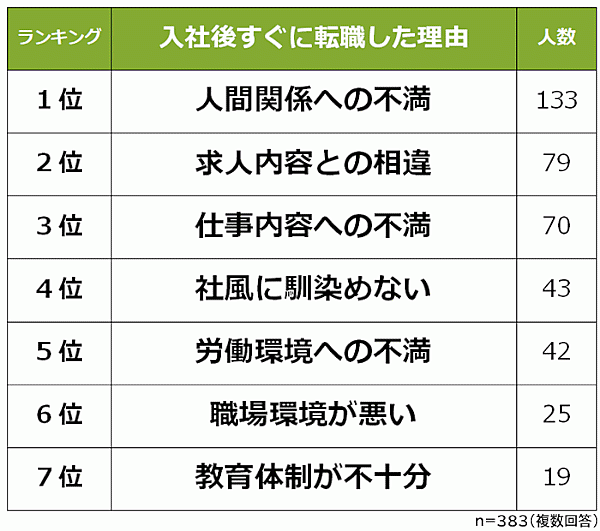 ビズヒッツが運営するメディア「Biz Hits」は、「入社後すぐに転職した理由」に関する調査結果を発表した。入社後1か月以内に転職した経験のある383人が回答している。