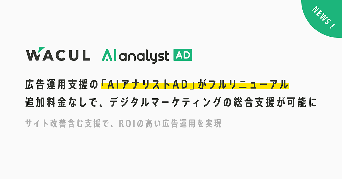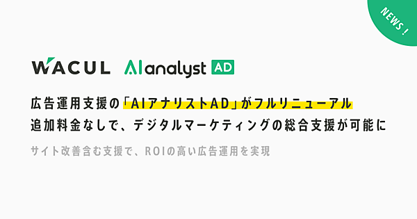AI(人工知能)を活用したマーケティングツールを展開するWACUL(ワカル)は、広告運用支援サービス「AIアナリストAD」を全面リニューアルした、と1月14日発表した。デジタルマーケティングの総合的なサポートを追加料金なしで可能にし、企業のデジタルマーケティングの全体最適化と、それによる成果の最大化が実現できるようにした。