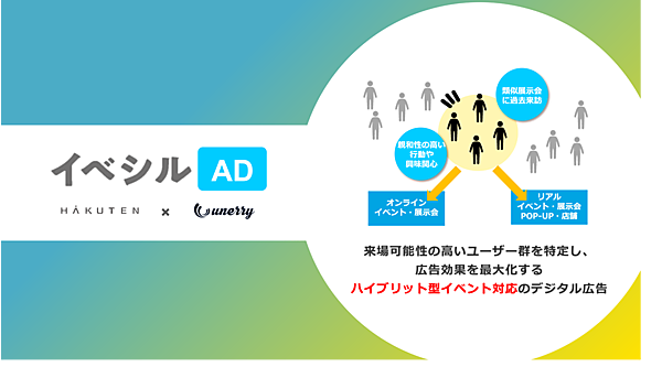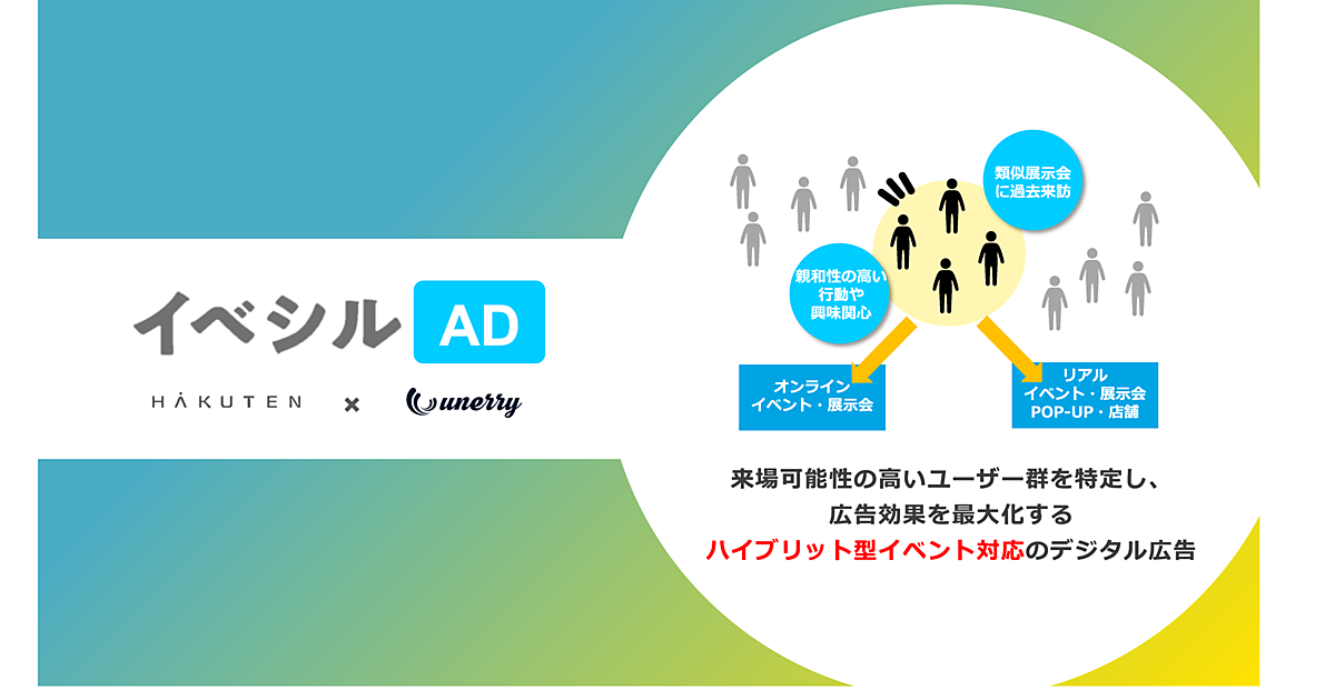 リアル行動データプラットフォーム運営のunerryは、イベントを中心にしたマーケティング支援事業の博展とともに、イベント集客のためのデジタル広告「イベシルAD」のサービスを始めた、と1月18日発表した。unerryが持つ月間200億件以上のスマートフォン位置情報ビッグデータと、博展のイベントデータベースを組み合わせて高精度のターゲティングを実現する。