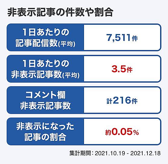 ヤフーは、ニュース媒体各社の記事を掲載するインターネットニュース配信サービス「Yahoo!ニュース」のコメント欄「Yahoo!ニュース コメント」の健全化を目的に2021年10月19日に導入した非表示機能の同年12月18日までの2カ月の状況を1月20日に発表した。非表示になった記事は計216件で、1日の平均は3.5%だった。1日の配信記事の0.05%ほどにあたる。