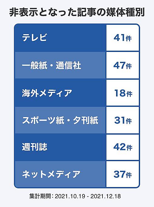 非表示機能は、一定以上の投稿数がある記事のコメント欄を対象に、AI(人工知能)が判定した違反コメント数などの基準に基づいて自動で非表示にする仕組み。コメント欄が非表示になった記事の媒体別は、テレビ41件▽一般紙・通信社47件▽海外メディア18件▽スポーツ紙・夕刊紙31件▽週刊誌42件▽ネットメディア37件。さまざまな媒体・記事に及んでいた。