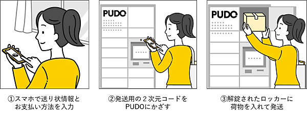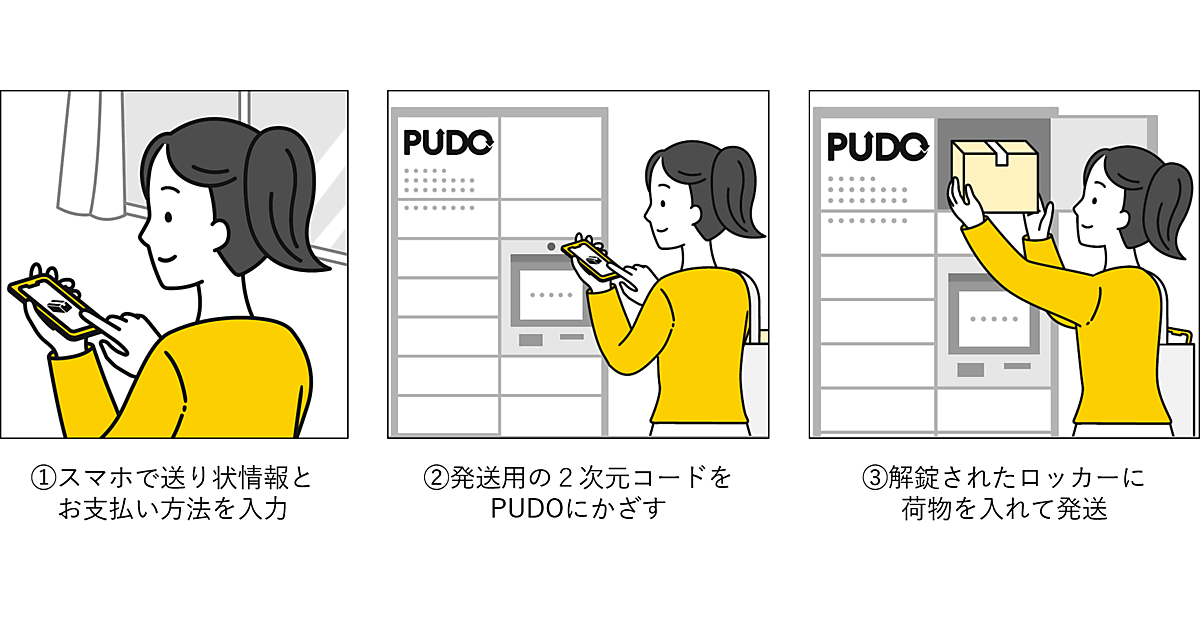 PUDOではスマートフォンで送り状情報と支払い方法を入力して発送用の2次元コードをかざし、解錠されたロッカーに荷物を入れて発送する仕組み。送れるのは、発払い・着払いの「宅急便」60~100サイズか、発払いの「宅急便コンパクト」▽運賃支払いがオンライン決済の荷物(ヤマトの会員組織「クロネコメンバーズ」登録が必要)▽常温の荷物。