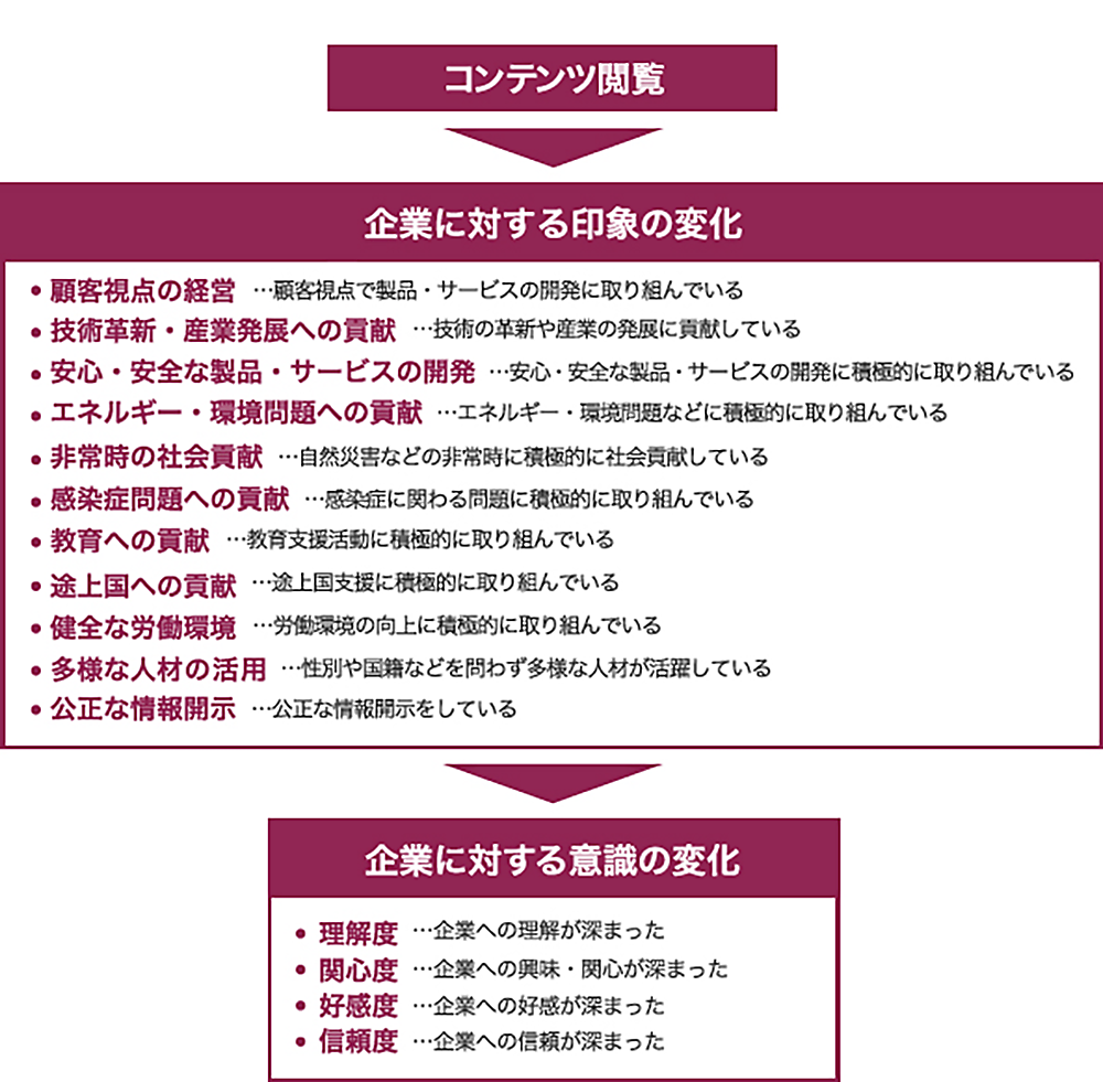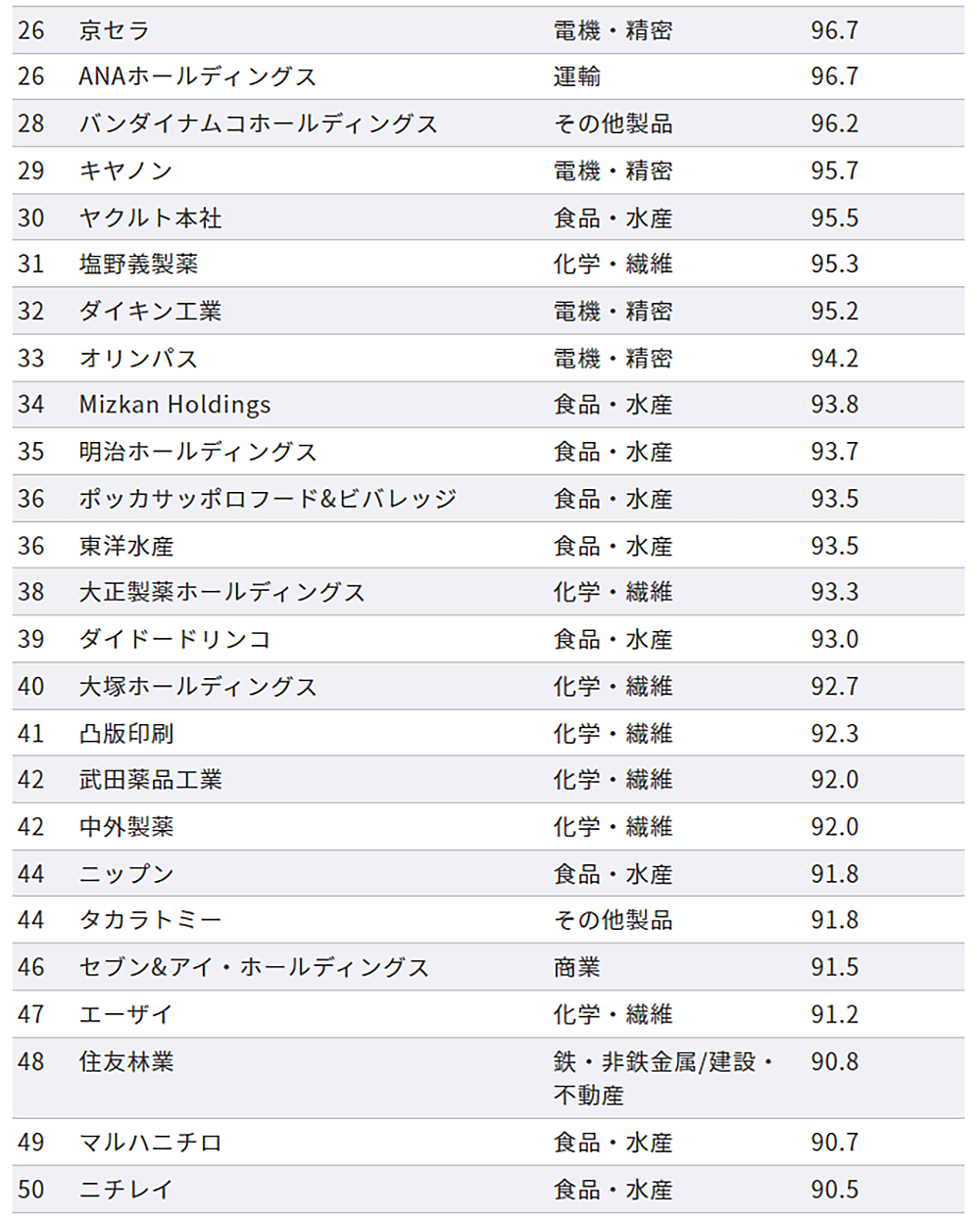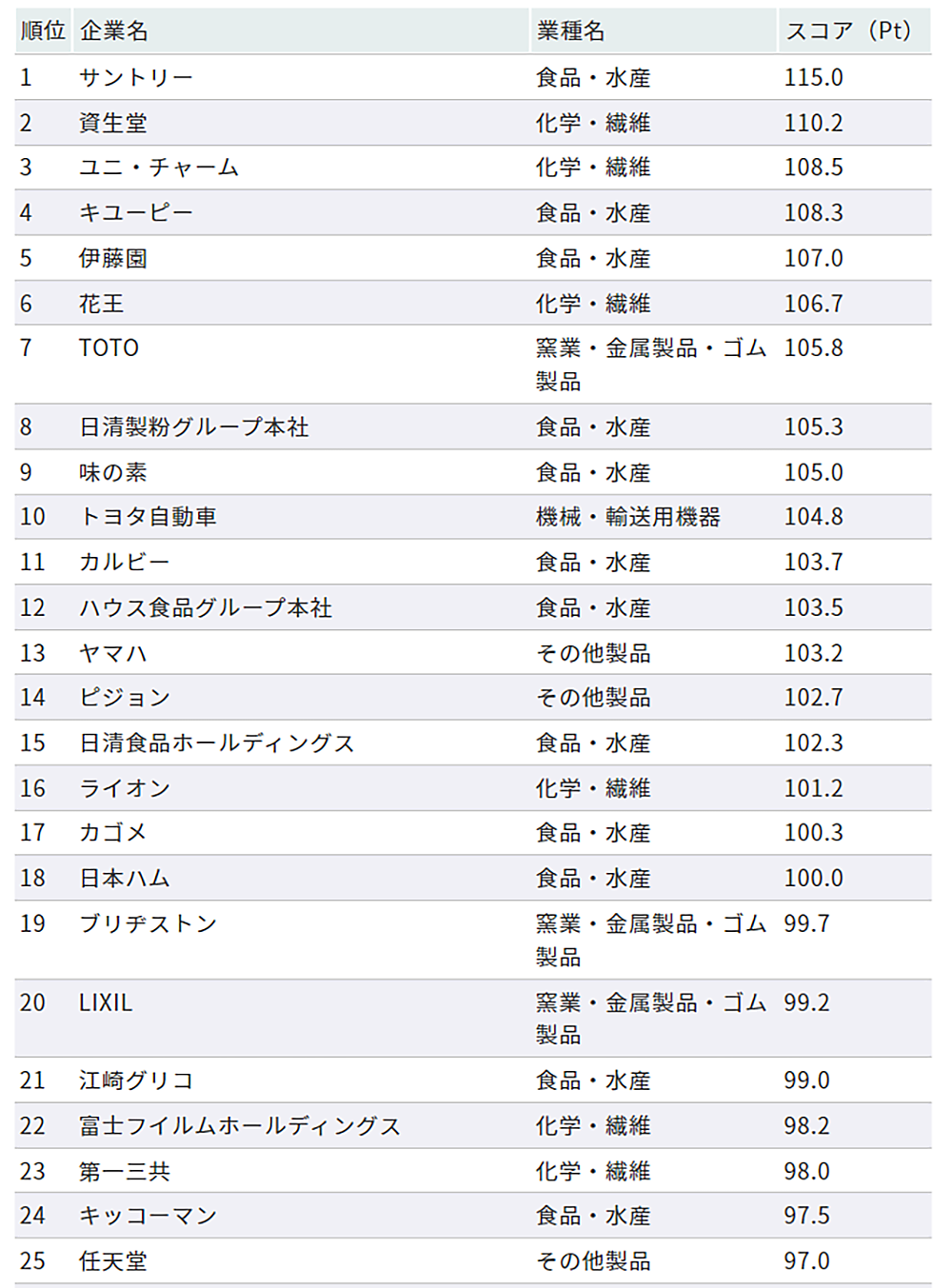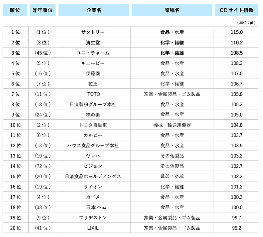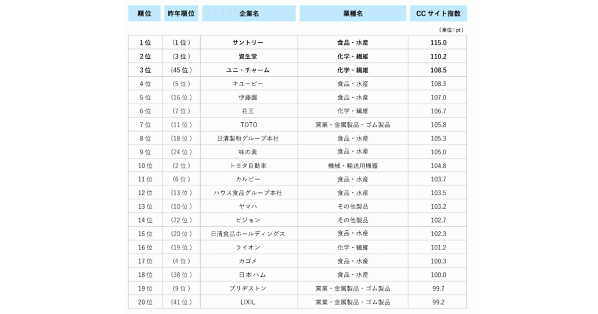 以下、2位「資生堂」110.2ポイント(2020年3位)、3位「ユニ・チャーム」108.5ポイント(2020年45位)が続いた。2020年は、サントリーのみが100ポイント超えを果たしたが、今回は20社近くが100ポイント以上をマークした。また2020年同様、食品・水産や化学・繊維といった業種に属する企業が上位に躍進している。3位のユニ・チャームは今年企業サイトを一新しており、それが奏功した。