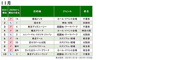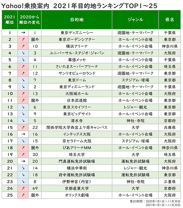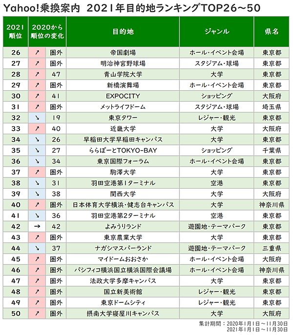 ヤフーは、乗換検索アプリ「Yahoo! 乗換案内」に関する調査結果を発表した。2021年に検索された目的地をすべて合計した年間ランキングに加えて、1~11月の各月ランキングを発表している。