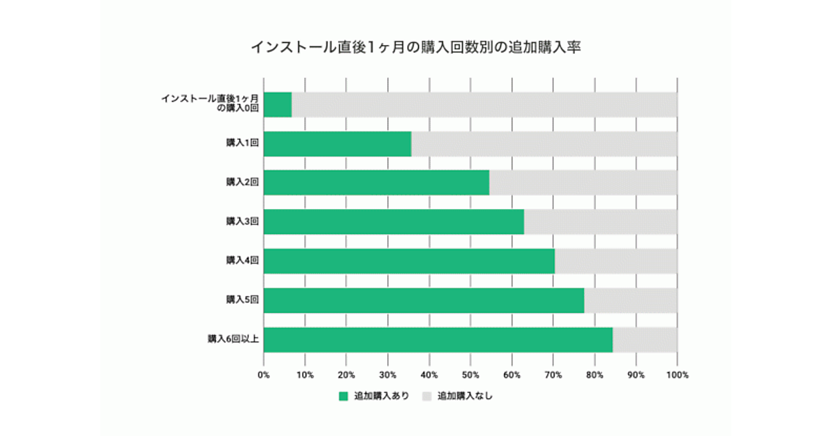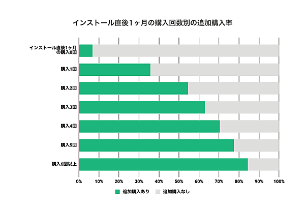 インストール直後1か月で1回も購入しなかったユーザーがその後なにかを購入する確率はわずか6.8%に留まっていたが、1回でも購入しているユーザーの追加購入率は35.6%、2回以上購入しているユーザーは50%を超えていた。そのため「初回ログインクーポン」などをプッシュ通知で配布する施策が、かなり有効と考えられる。