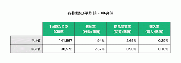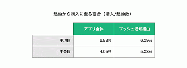 まずプッシュ通知1回あたりの「起動率」(起動/配信数)の平均値は4.97%、「商品閲覧率」(商品閲覧/配信数)は2.65%、「購入率」(購入/配信数)は0.29%だった。1,000通配信すれば1~3人が購入すると試算できる。なお、アプリ全体とプッシュ通知経由を比較しても、「起動から購入に至る割合」(購入/起動数)はさほど変わらなかった。