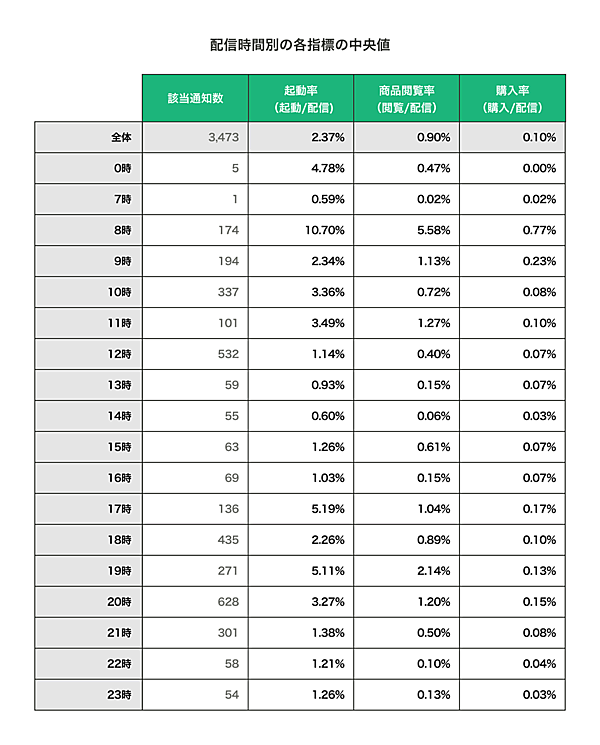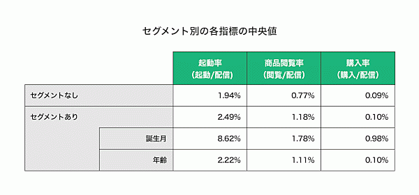 その他には、「(誕生月・年齢などによる)セグメント」ありのほうが起動率・購入率とも高いこと、「配信時間」において実際に購入率が高いのは8時・9時・17時台であることなどが判明したという。