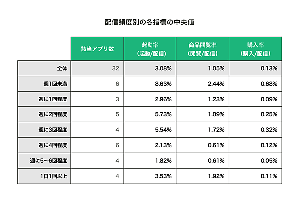 次に、プッシュ通知の「1週間あたりの配信回数」に合わせ、「起動率(起動/配信数)の中央値」「購入率(購入/配信数)の中央値」を算出すると、配信頻度が週1回未満のケースが起動率も購入率ももっとも高かった。しかし配信頻度が少ないとそもそもの起動数が減少してしまう。一方で頻度が多すぎると、通知をオフにされたりアプリをアンインストールされたりする可能性が出てくる。