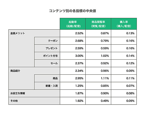 次に、購入率が高いプッシュ通知コンテンツを、指標の中央値で見ると、クーポンやプレゼントなど「金銭メリット訴求」タイプがやはり0.13%と高い。一方「商品紹介」0.09%、「お役立ち情報」0.08%も一定数が存在する。