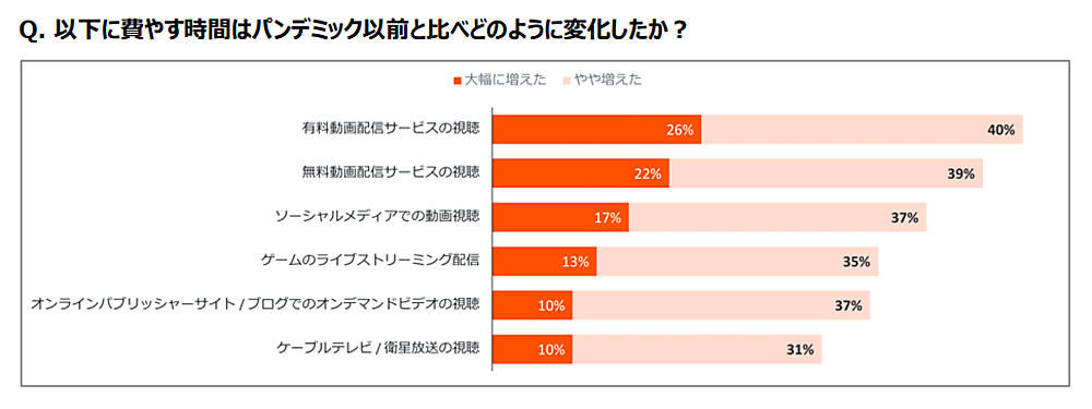 まず、さまざまなサービスや娯楽の消費時間について「パンデミック以前・以後で増えたもの」を聞くと、「有料の動画配信」「無料の動画配信」がそれぞれ最大の伸びを示した。具体的には5人に3人が、Netflix、Amazonプライム・ビデオ、Disney+、Apple TVといった配信サービスでの視聴が増えたと回答している。また回答者の半数近くが、1週間に無料コンテンツを5時間以上、有料コンテンツを最大10時間視聴していた。