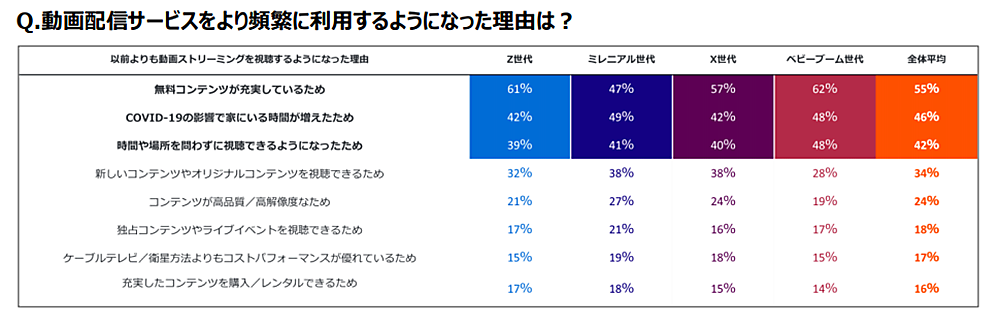 「動画配信サービスをより頻繁に利用するようになった理由」を聞くと、「無料コンテンツが充実している」「コロナの影響で家にいる時間が増えた」「時間や場所を問わずに視聴できるようになった」といった理由が上位となった。これは4世代すべてで同じ順となっている。また「新しいコンテンツやオリジナルコンテンツを視聴できる」「ケーブルテレビや衛星放送よりもコスパがいい」といった声もあがっている。