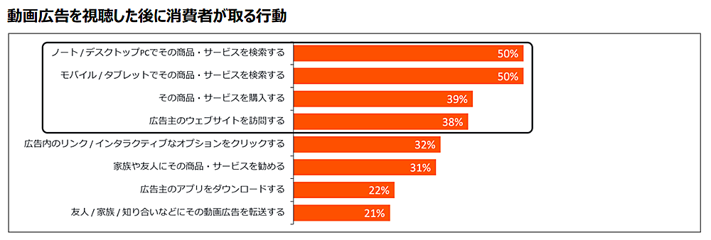「動画広告を視聴した後に消費者が取る行動」について集計すると、「PCでその商品・サービスを検索する」「モバイルでその商品・サービスを検索する」がともに50%ずつ、「その商品・サービスを購入する」が39%と、5人に2人が広告視聴後に商品購入にまで至っていた。「家族や友人に勧める」31%、「広告主のアプリをダウンロードする」22%といった回答も存在する。世代別では、特にミレニアル世代とZ世代が、購入の意思決定に動画配信サービスの影響を受ける傾向が強かったという。