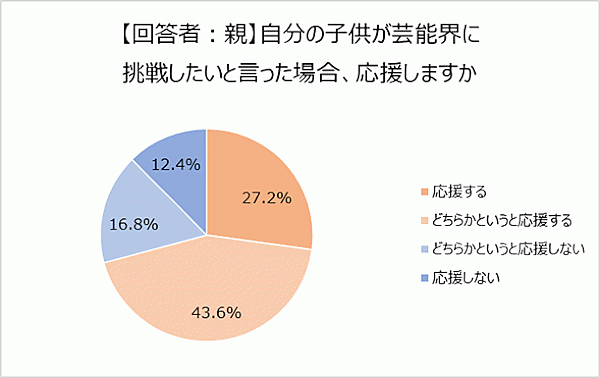 次に女子小学生の子供がいる人に対して、「自分の子供が芸能界に挑戦したいと言った場合、応援するか」と聞くと、「応援する」27.2%、「どちらかというと応援する」43.6%と、7割以上が挑戦を応援する姿勢を見せた。なお、「自分の子供に芸能オーディションを受けてほしいと思ったことがあるか」を聞くと、15.8%の親が「ある」と回答している。