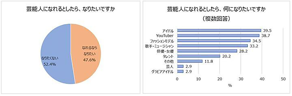 まず女子小学生に対して、「芸能人になれるとしたらなりたいと思うか」と聞くと、「なれるならなりたい」47.6%、「なりたくない」52.4%とほぼ半分に分かれた。そこでなりたいという女子小学生に「どのようなジャンルで活躍したいか」を聞くと、「アイドル」39.5%が、「YouTuber」38.7%をわずかに上回り1位だった。アイドルをあげた女子は「好きなアイドルがいるから」「可愛い洋服を着て踊りたい」「ダンスや歌が好きだから」、「YouTuber」をあげた女子は「世界中の人達に情報を発信できる」「広告収入を得たい」といった理由だった。