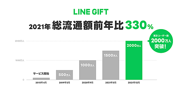 LINEは、通信アプリの「LINE」を通じて「友だち」にプレゼントを贈ることができるサービス「LINEギフト」で2021年12月の総流通額が前年比440%超となり、21年の年間総流通額は前年比330%、贈ったりもらったりした累計ユーザー数が21年12月時点で2000万人を超えた、と1月26日に発表した。