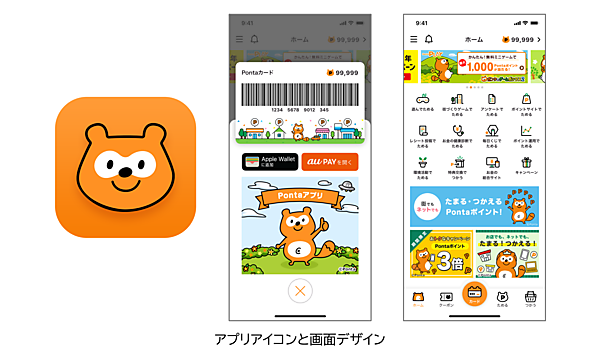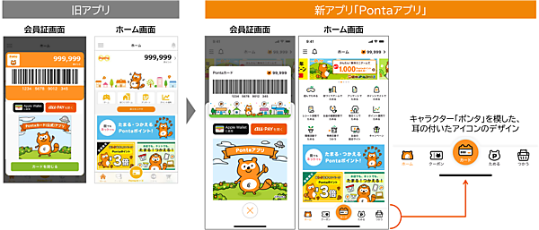 アプリのリニューアルでUI(ユーザーインターフェース)を改善するため、デザインを一新して色味を統一し、直感的に操作できるようにした。ホーム画面にPontaがたまるサービスやつかえるサービスをシンプルで分かりやすいアイコンで一覧表示し、各メニューにすぐに遷移できようにした。画面上部には、おすすめ情報をスライドショーで掲載して、さまざまなコンテンツにアクセスしやすくした。