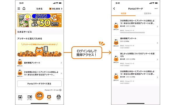 アプリから「Pontaリサーチ」のマイページにログインなしでアクセスできるようになったので、日常生活でPontaポイントをためて、つかう「ポン活」がより簡単にできる。Pontaのスマートフォンアプリは、これまでに1000万件以上ダウンロードされており、「デジタルPontaカード」や「au PAY(コード支払い)」の機能、Pontaポイントが当たる「毎日くじ」、Ponta提携社でつかえるクーポンなどにアクセスできる。