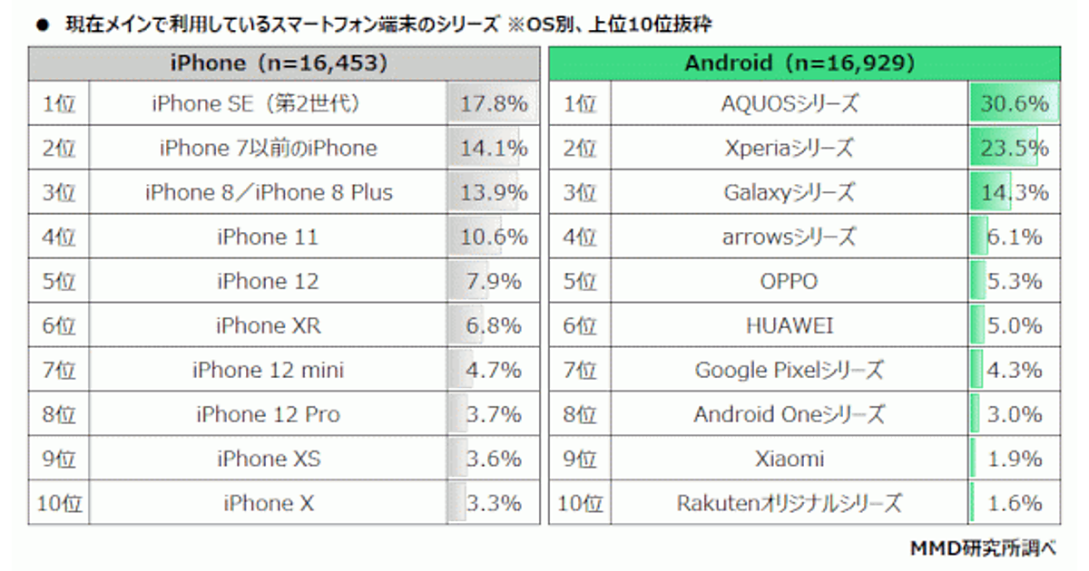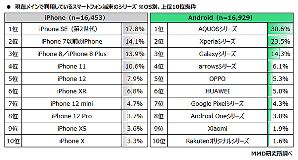 メイン利用している端末、iPhoneは「SE2」が人気、Androidはどのメーカーが1位に? 【MMD研調べ】